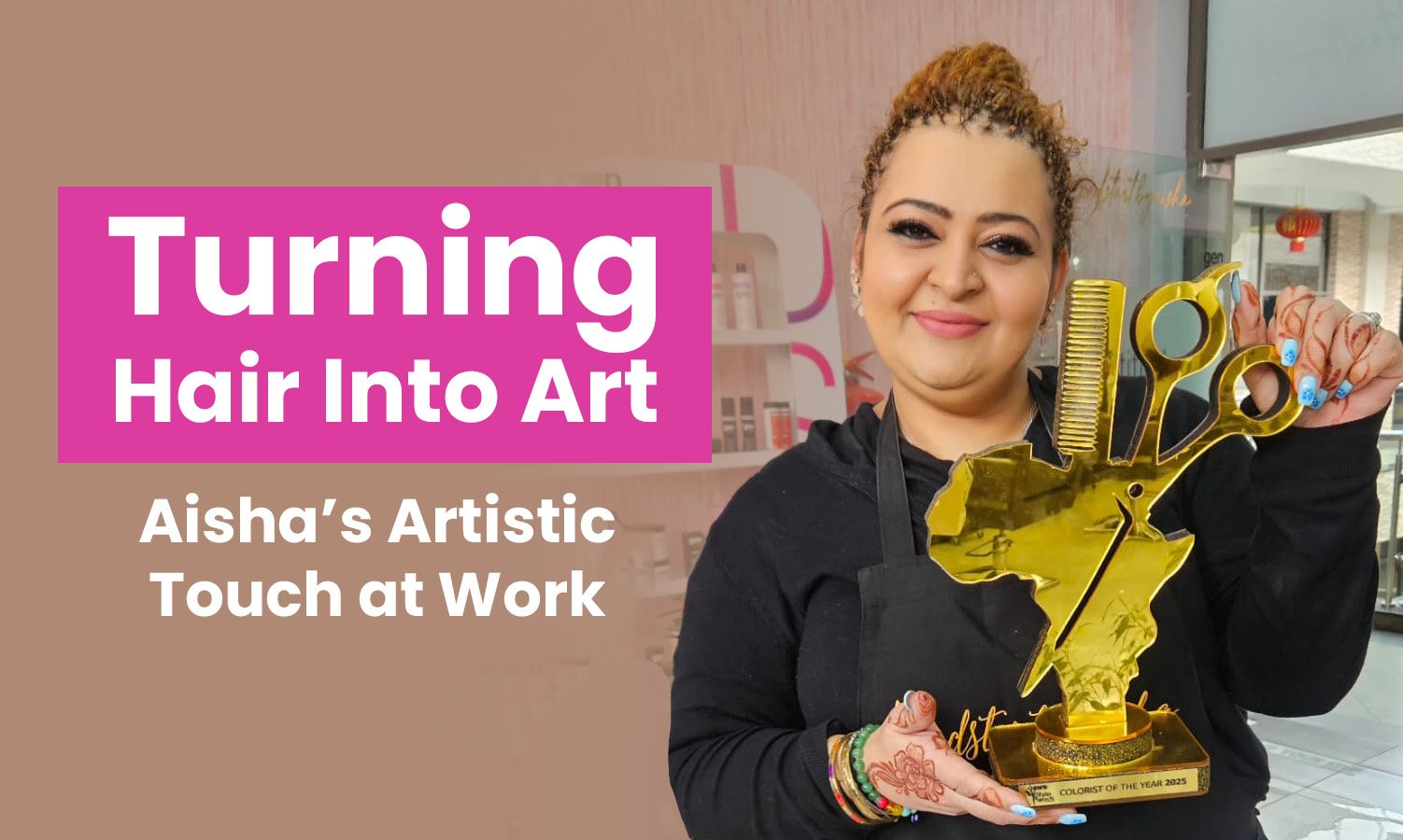 Hello, I am Aisha Mohammed Fazal, but my friends and family call me Asha. I have worked as a hairdresser and colorist for 20 years. At first, I wasn’t sure hairdressing was right for me. However, just one week into hair school, I found my passion. Today, I am an award-winning colorist and a nominee for hairstylist of the year. My career has been a journey of learning, growth, and doing what I love most, which is helping people feel confident.