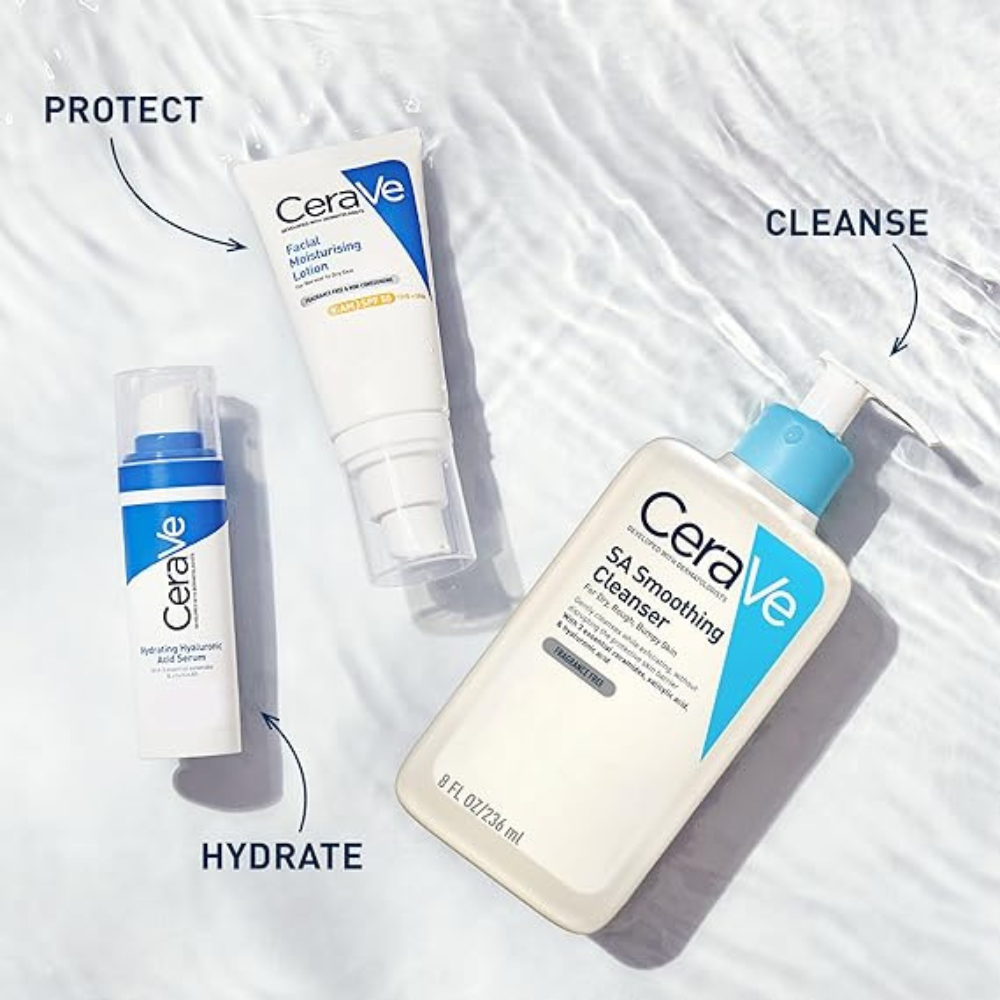 CeraVe SA Smoothing Cleanser is a foaming gel cleanser formulated with salicylic acid to exfoliate rough and bumpy skin. With three essential ceramides and hyaluronic acid, this cleanser smooths and hydrates without irritation.