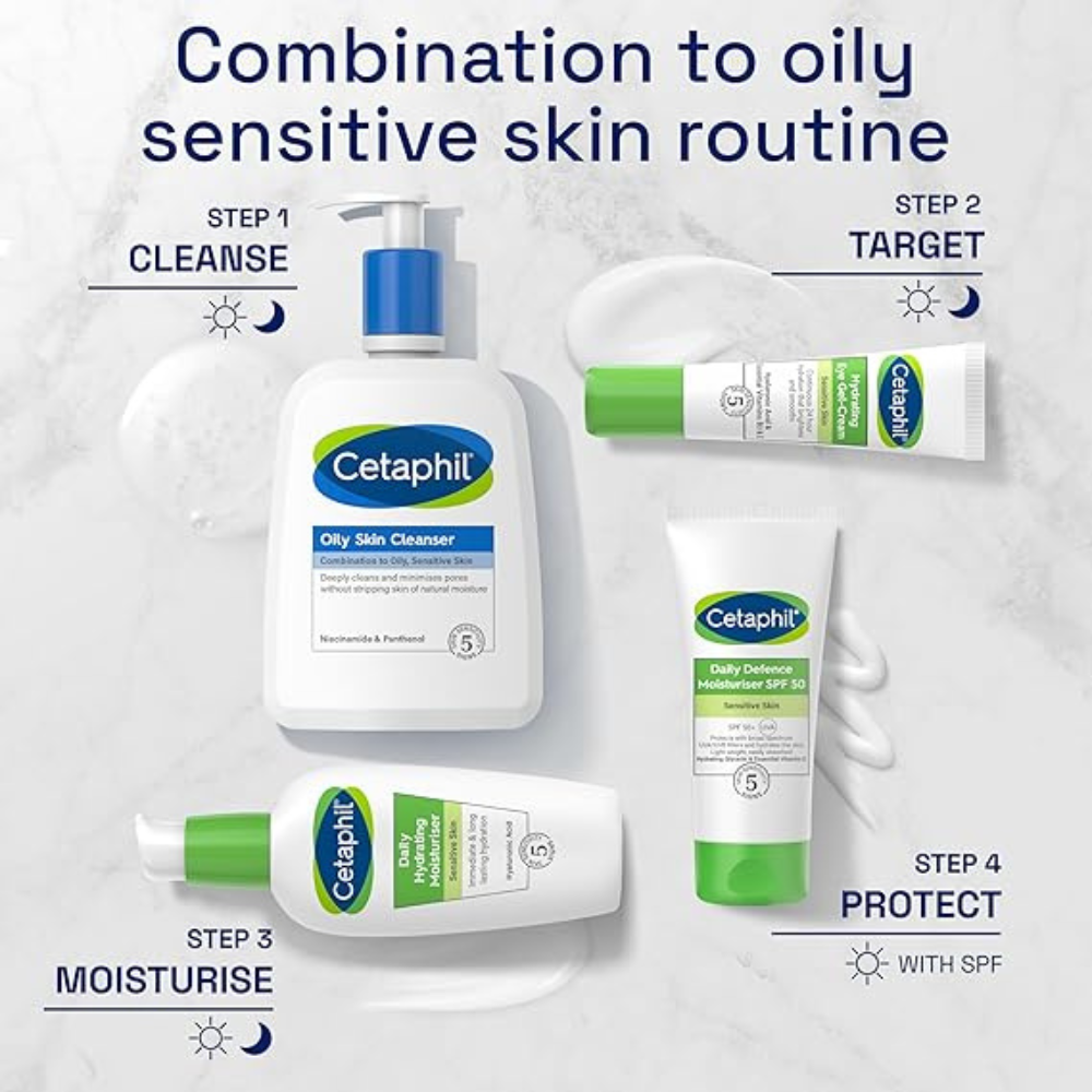 Cetaphil Oily Skin Cleanser is a gentle gel-to-foam formula that deeply cleanses oily to combination, sensitive skin. Enriched with Niacinamide and Panthenol, it removes dirt, excess oil, and makeup while maintaining the skin’s natural moisture barrier, leaving it clean and balanced without feeling dry or tight.