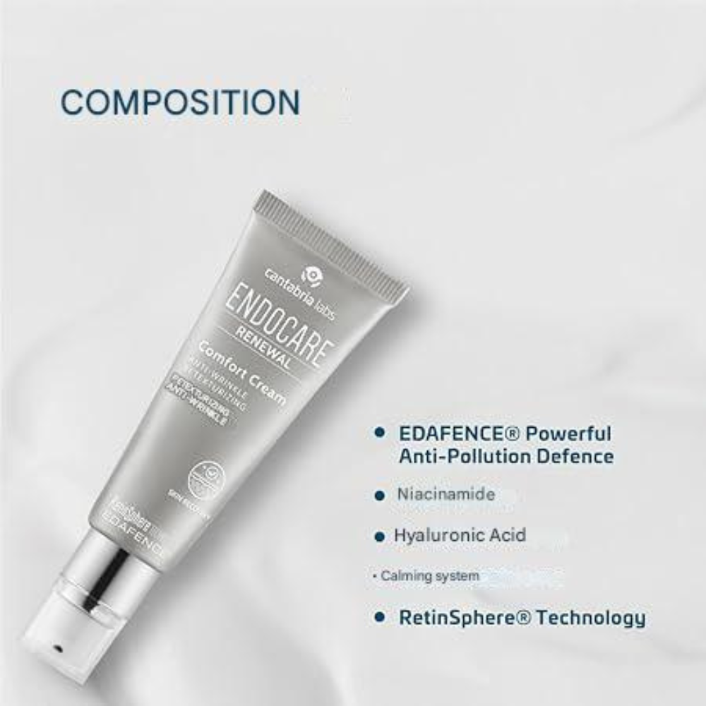 Endocare Renewal Comfort Cream is the perfect solution for dry and sensitive skin, providing intense hydration while soothing irritation. Formulated with a blend of nourishing ingredients, it helps to restore the skin’s natural moisture balance, leaving it soft and revitalized. The cream features Hyaluronic Acid to deeply hydrate and maintain moisture, while EDAFENCE®, a patented active ingredient, protects against environmental aggressors like pollution. With its anti-aging properties, the cream also works to reduce fine lines and wrinkles, improving overall skin texture and elasticity. Regular use promotes a more youthful, radiant complexion. Tested under dermatological and ophthalmological control, it’s a non-comedogenic, gentle solution for sensitive skin.