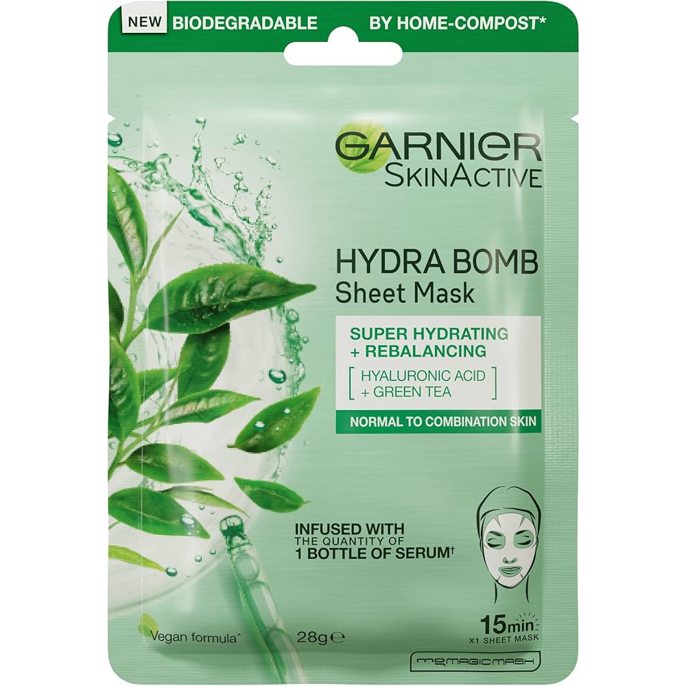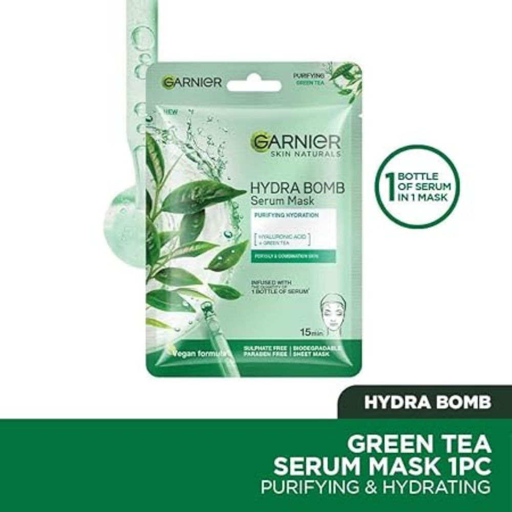 Garnier Hydra Bomb Green Tea Tissue Mask is a hydrating and mattifying face mask designed for normal to combination skin. Enriched with Green Tea extract, it purifies, reduces pores, and provides lasting hydration for a balanced, glowing complexion.