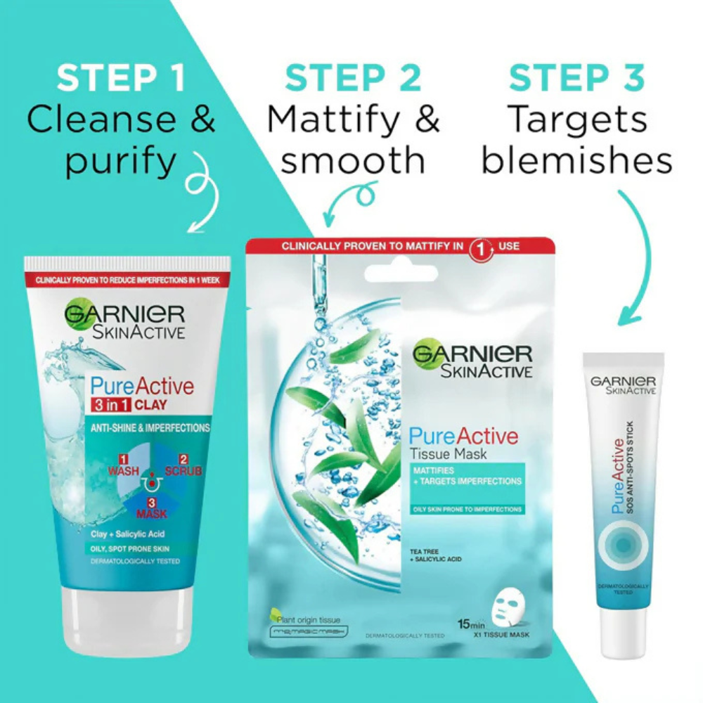 Garnier Pure Active 3-In-1 Wash, Scrub, and Mask is a triple-action skincare product for oily skin. It purifies, unclogs pores, and controls shine to reveal clear, matte skin.