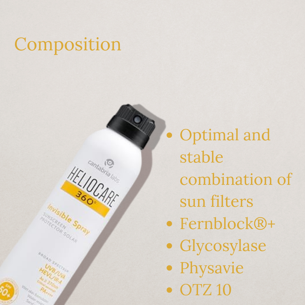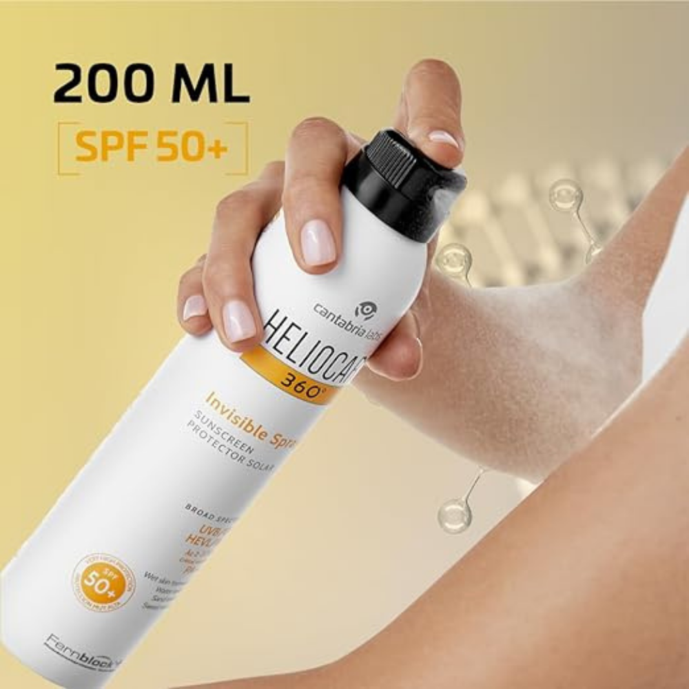 Heliocare 360º Invisible Spray SPF 50+ delivers advanced sun protection in an easy-to-use transparent spray. Its continuous spray format ensures effortless application and even coverage, effective even on wet skin thanks to its innovative WET SKIN formula. Perfect for outdoor activities, this spray offers a refreshing, invisible finish that is water- and sand-resistant.