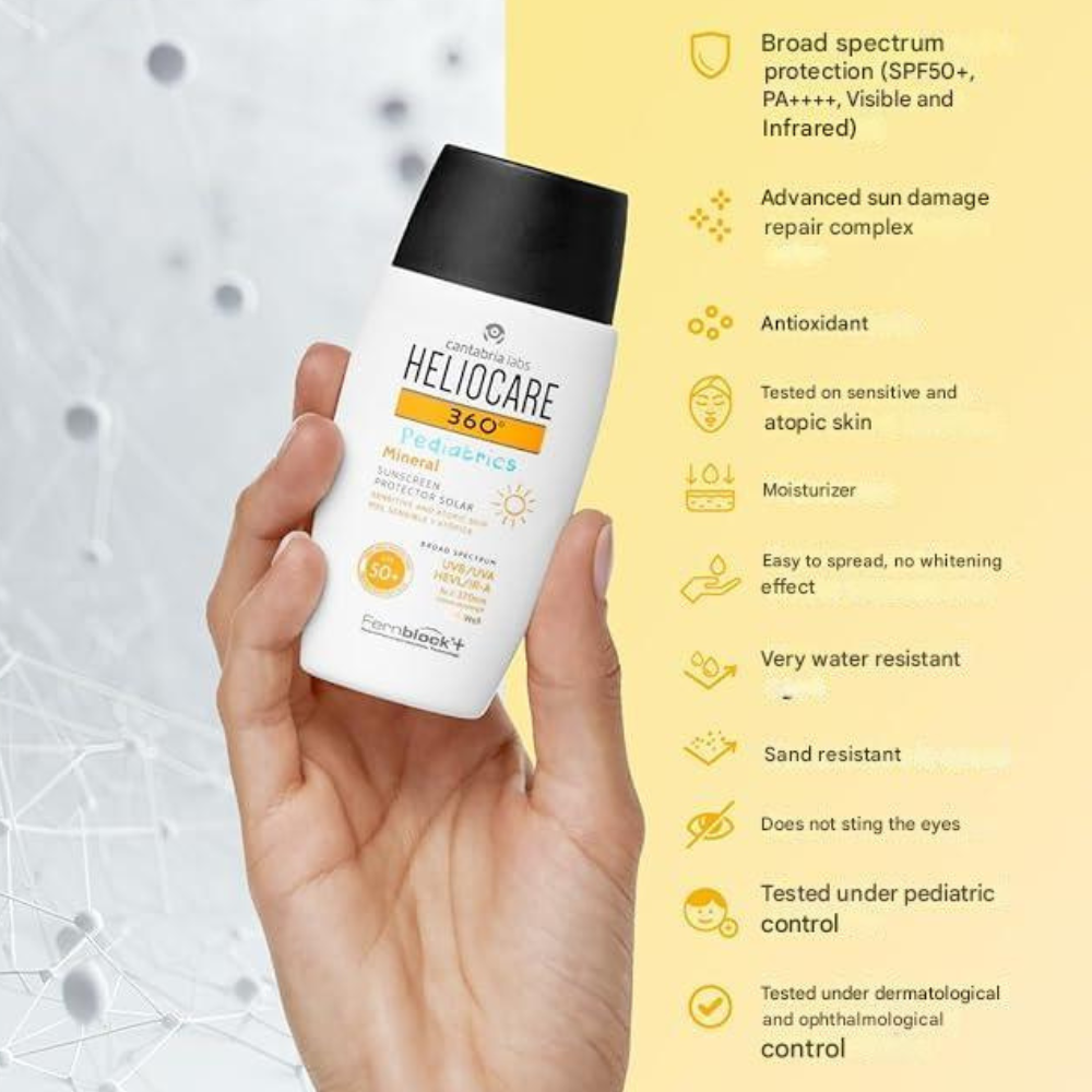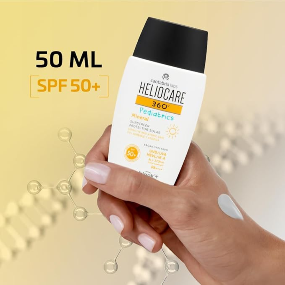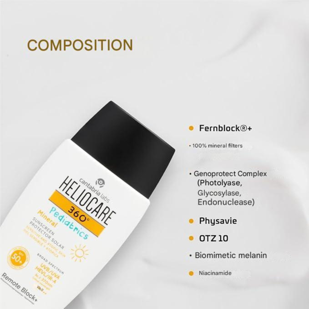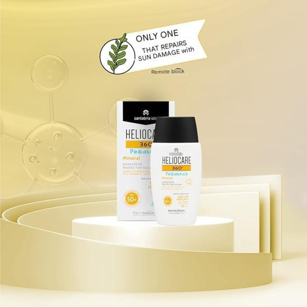 Heliocare 360º Pediatrics Mineral SPF 50+ is a gentle and effective mineral sunscreen specially formulated for children’s sensitive and atopic skin. Featuring 100% mineral filters, this high-tolerance formula ensures broad-spectrum protection against UVB, UVA, visible light, and infrared radiation while repairing and neutralizing sun damage.