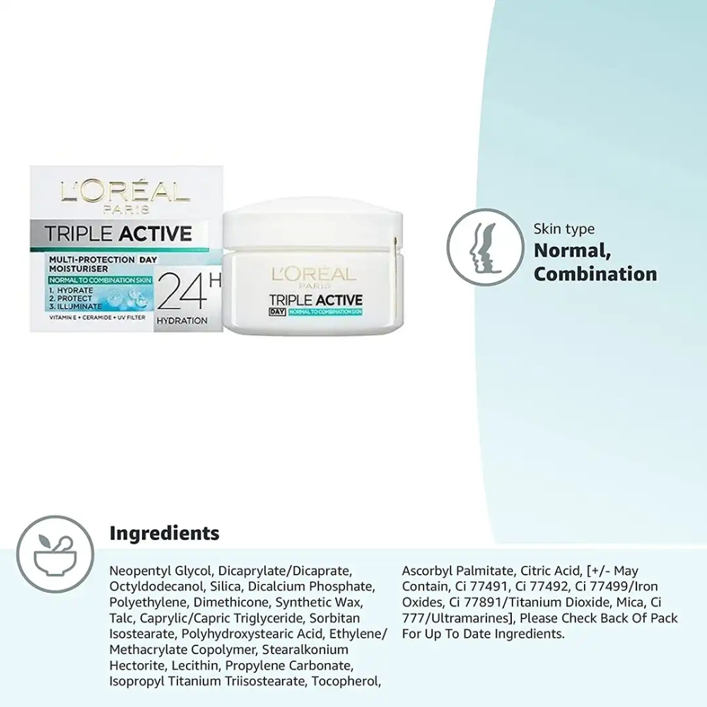 Every day, your skin is exposed to environmental aggressions like UV rays, pollution, and stress, which can lead to premature aging, dehydration, and a weakened skin barrier. L’Oréal Paris Triple Active Combination Skin Hydrator is specially formulated to address these challenges by providing long-lasting hydration, protection, and radiance.
