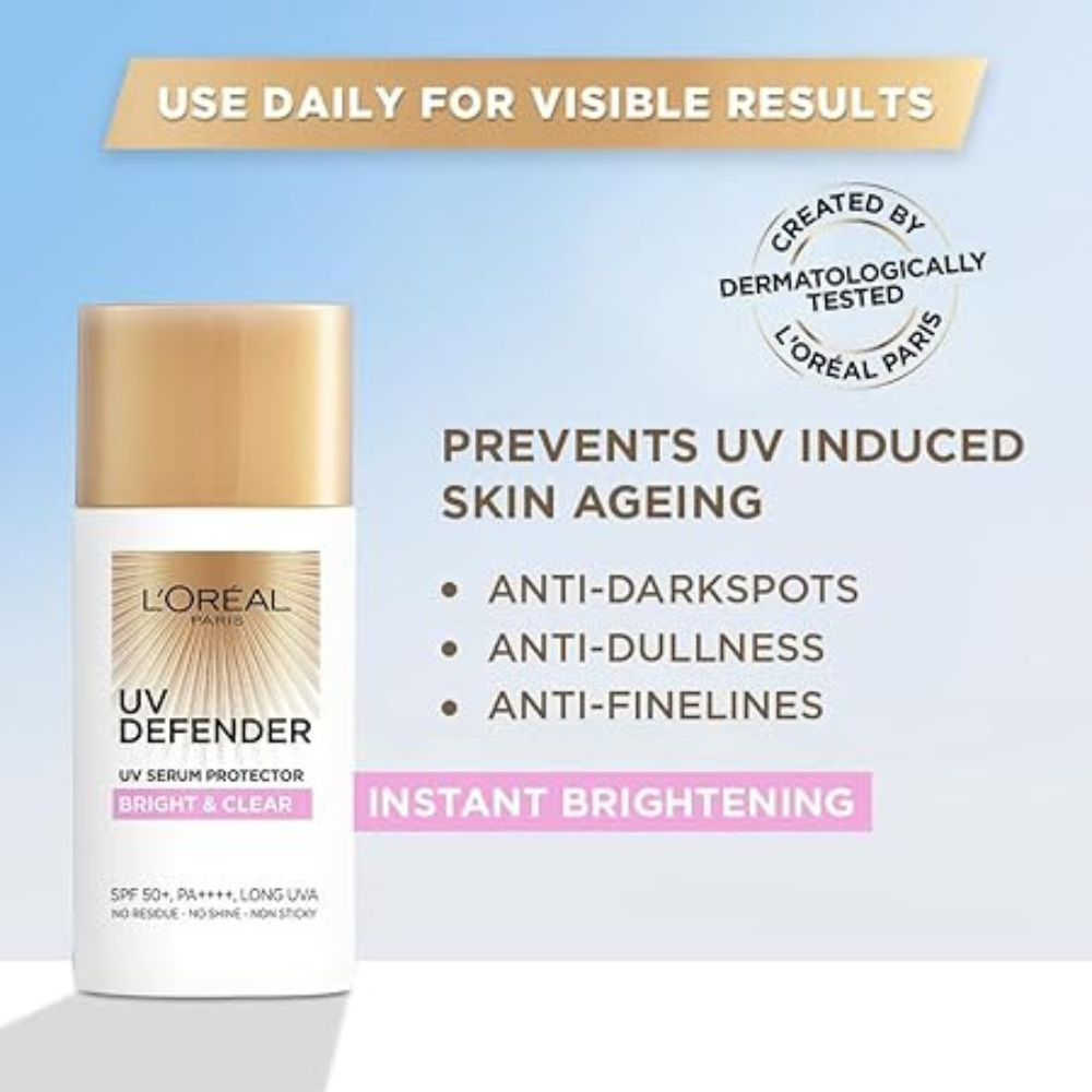 L’Oréal Paris UV Defender Instant Bright Anti-Aging Sunscreen SPF 50+ is a broad-spectrum sunscreen designed to protect skin from aging effects of UV rays, including dark spots and fine lines. Infused with Niacinamide, it offers instant brightening with a lightweight, non-greasy finish.