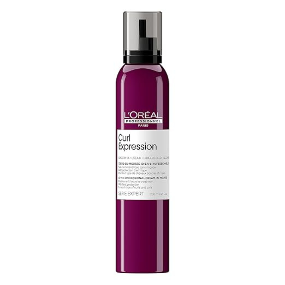 L’Oréal Curl Expression 10-in-1 Cream-in-Mousse Leave-In combines the nourishment of a cream with the hold of a mousse. Designed for curls and coils, it hydrates, defines, strengthens, and protects hair without crunch or residue.