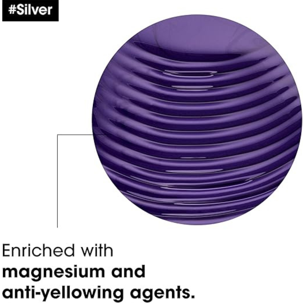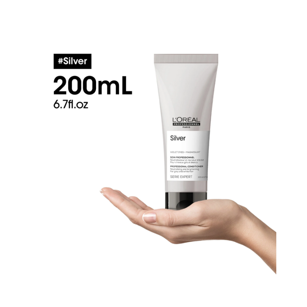 L’Oréal Professionnel Serie Expert Silver Conditioner tones and nourishes grey, white, and blonde hair, neutralizing brassiness and yellow tones while adding softness, shine, and hydration.