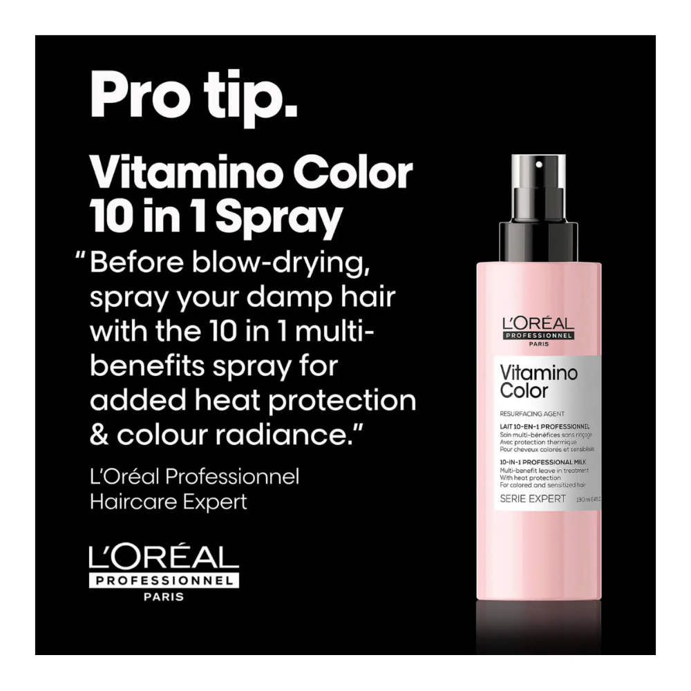 L’Oréal Professionnel Serie Expert 10-in-1 Colour Protecting Spray provides 10 essential benefits for coloured hair, including heat protection up to 230°C, shine, hydration, anti-breakage, and smoothness.