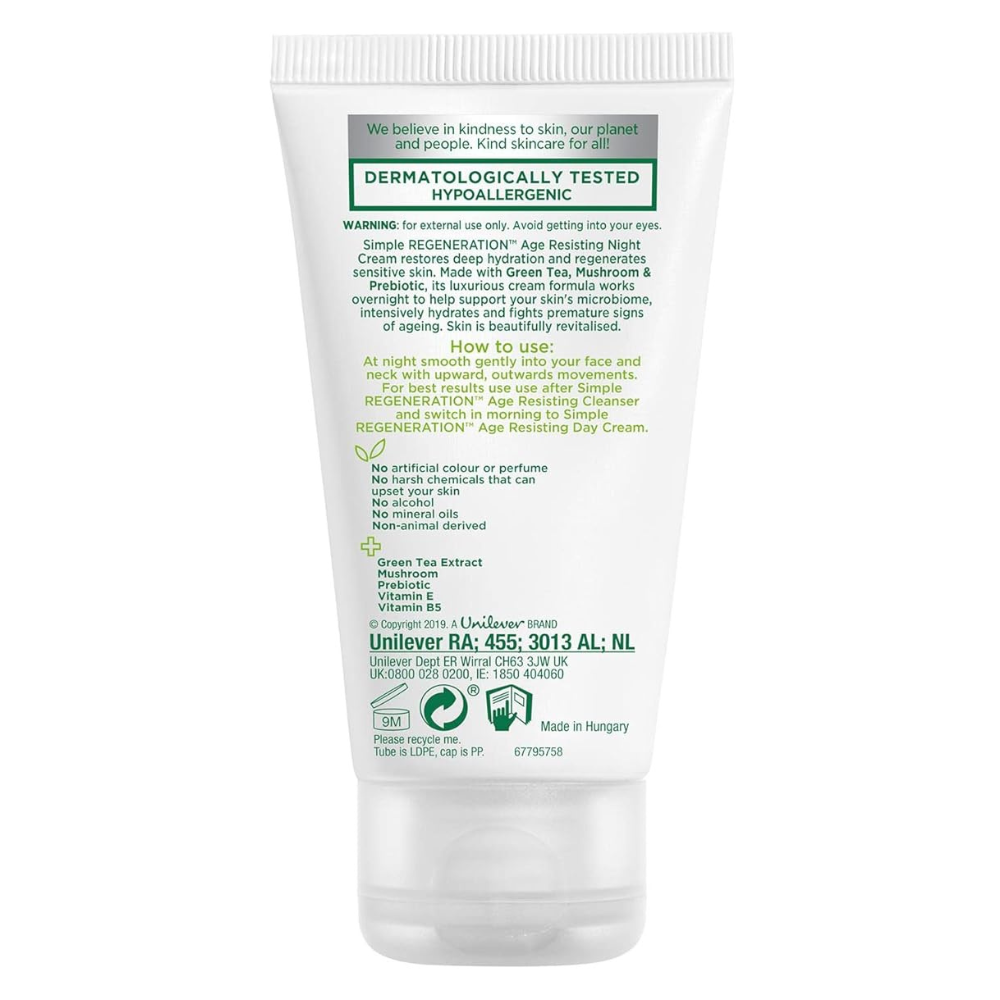 Nourish and rejuvenate your skin while you sleep with Simple Kind to Skin Regeneration Night Cream. Specifically designed for sensitive skin, this rich yet non-greasy night cream helps your skin recover and repair overnight. Formulated with Pro-Vitamin B5, Vitamin E, Mushroom Extract, Oat-Beta Glucan, Chamomile, Ginkgo Biloba, Borage Seed Oil, Shea Butter, and Green Tea Extract, it deeply moisturizes, revitalizes, and softens your skin. This dermatologist-approved formula is free from artificial perfumes, colors, and harsh chemicals, ensuring a gentle yet effective night-time skincare solution that helps reduce the appearance of premature aging.