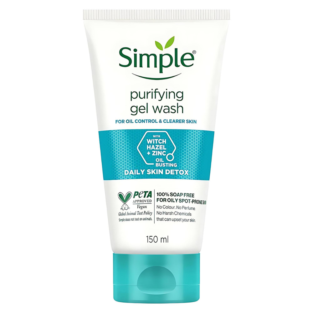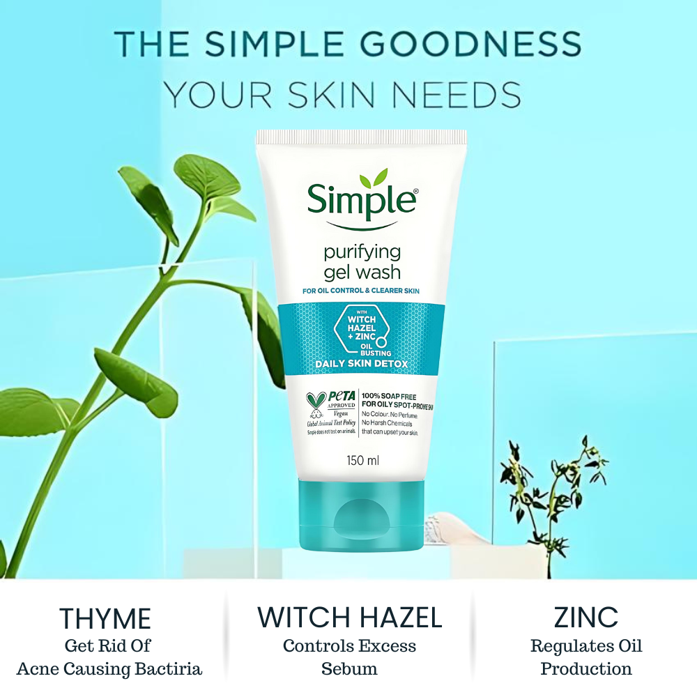 Fight clogged pores and excess oil with Simple Daily Skin Detox Purifying Facial Wash. This gentle yet effective formula with thyme, zinc, and witch hazel delivers clearer, shine-controlled skin from day one.