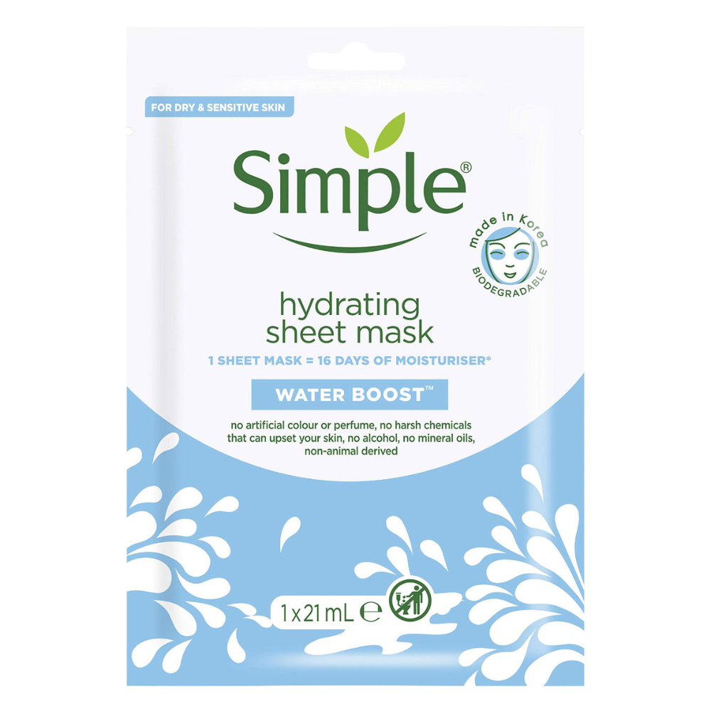 Simple Water Boost Hydrating Sheet Mask revitalizes dry, dull skin with minerals and plant extracts, offering deep hydration and a dewy glow.