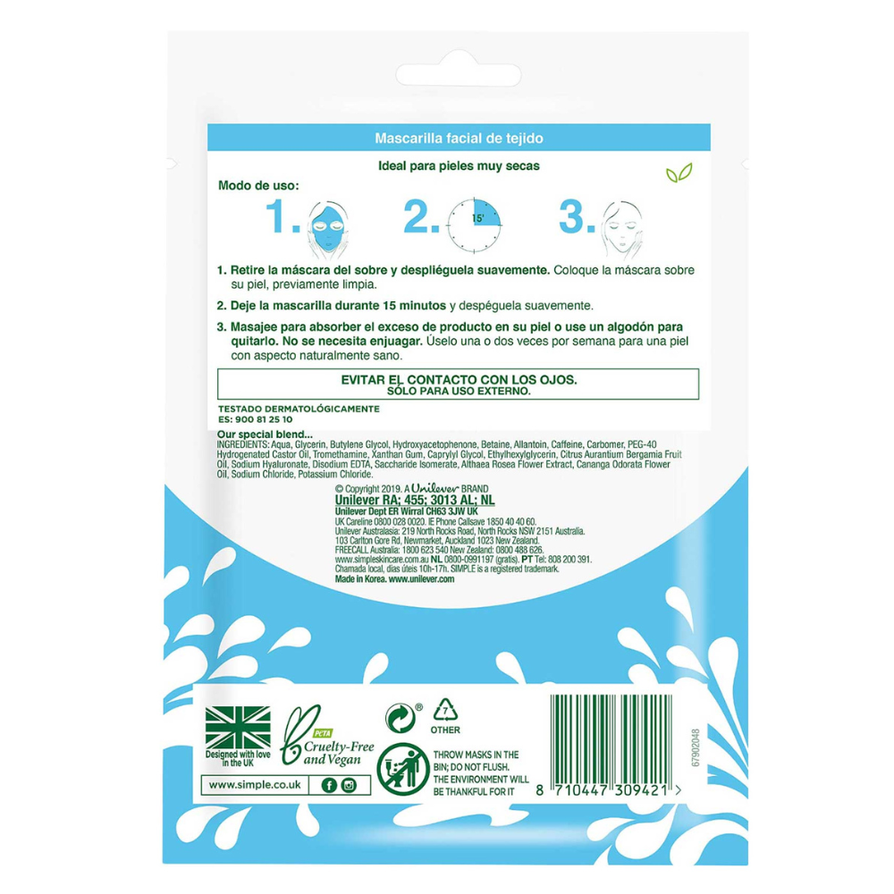 Simple Water Boost Hydrating Sheet Mask is a potent solution designed to combat dry, rough, and dull-looking skin. Inspired by Korean skincare rituals, this mask is made from natural fibers that contour perfectly to your face, delivering an intense hydration boost to restore suppleness and freshness. Enriched with a blend of skin-loving minerals, plant extracts, and hydrolyzed hyaluronic acid, it helps lock in moisture, supporting cell renewal and leaving your skin with a radiant, dewy glow.