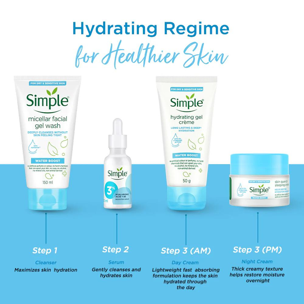 Simple Water Boost Micellar Facial Gel Wash delivers deep cleansing and hydration for all skin types, with a gentle formula that maintains moisture balance. Perfect for sensitive skin.