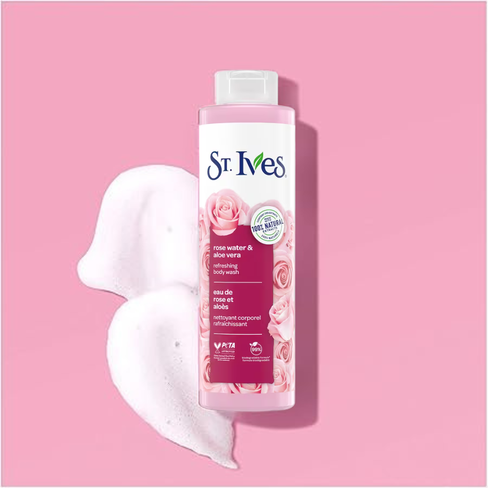 Refresh your skin and senses with St. Ives Rose Water & Aloe Vera Refreshing Body Wash (650ml) — a hydrating, nature-inspired cleanser that leaves your skin soft, supple, and beautifully renewed. Infused with 100% natural rose and aloe vera extracts, this body wash creates a rich, soothing lather that gently cleanses while helping your skin stay hydrated and refreshed all day long.